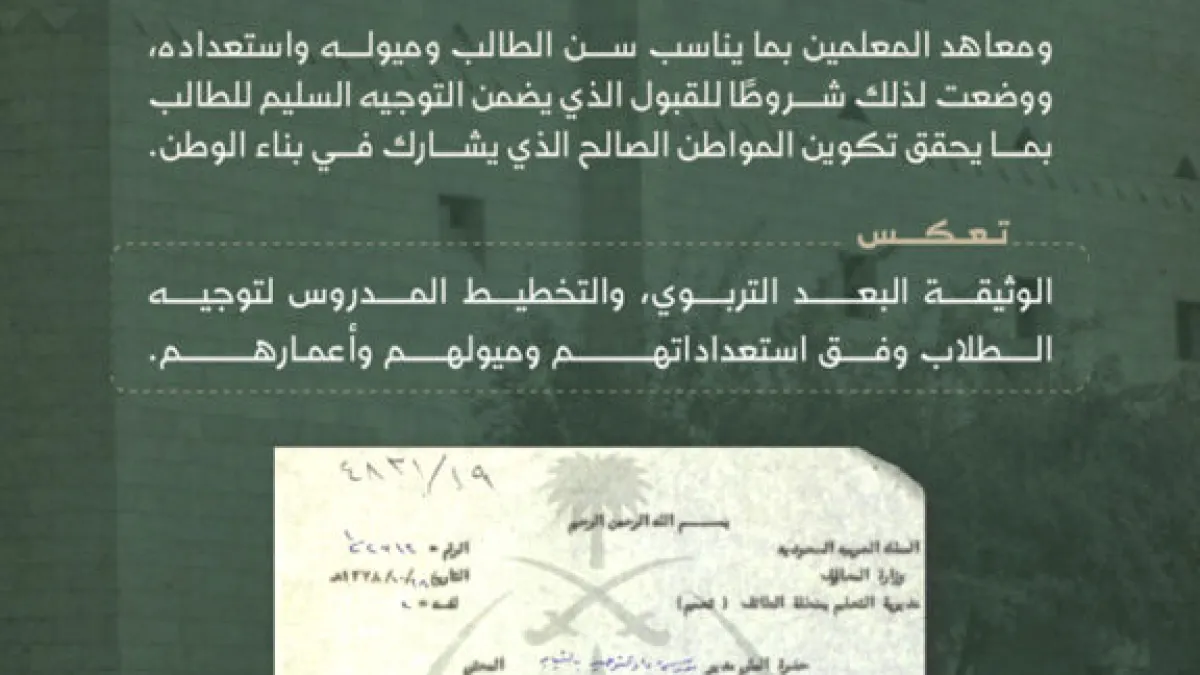 إن نشر هذه الوثائق التاريخية يمثل جسرًا يربط بين الأجيال، ويؤكد أن الاستثمار في الإنسان وتوجيهه نحو المسار الصحيح لم يكن وليد اللحظة، بل هو نهج راسخ في مسيرة بناء الدولة السعودية وتطورها المستمر، وهو ما يعزز أهمية الإرشاد التعليمي في مدارس المملكة اليوم.