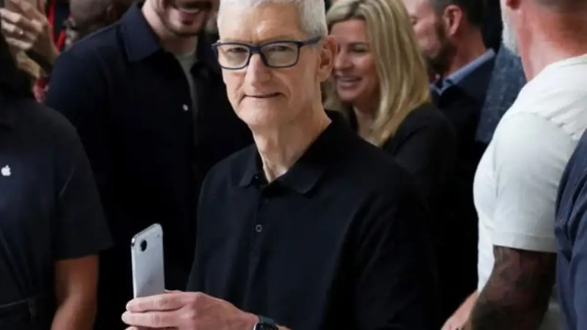 تيم كوك الرئيس التنفيذي لشركة أبل يحمل هاتفي آيفون آير (المصدر: رويترز)