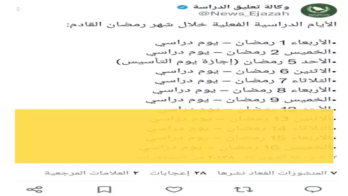 وزارة التعليم السعودية أعلنت مؤخرًا عن جدول زمني لافت للانتباه يتضمن تقليص أيام الحضور الفعلي خلال شهر رمضان المبارك، حيث يستعد الطلاب لاستقبال فترة دراسية وجيزة لا تتجاوز أحد عشر يومًا فقط؛ وهو ما يعكس رغبة المؤسسة التعليمية في الموازنة بين التحصيل الأكاديمي والواجبات الدينية والاجتماعية التي تميز هذا الشهر الفضيل.